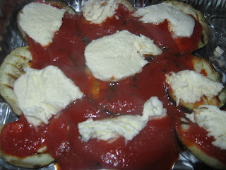 Mettete uno strato di salsa e mozzarella sul primo strato di melanzane.